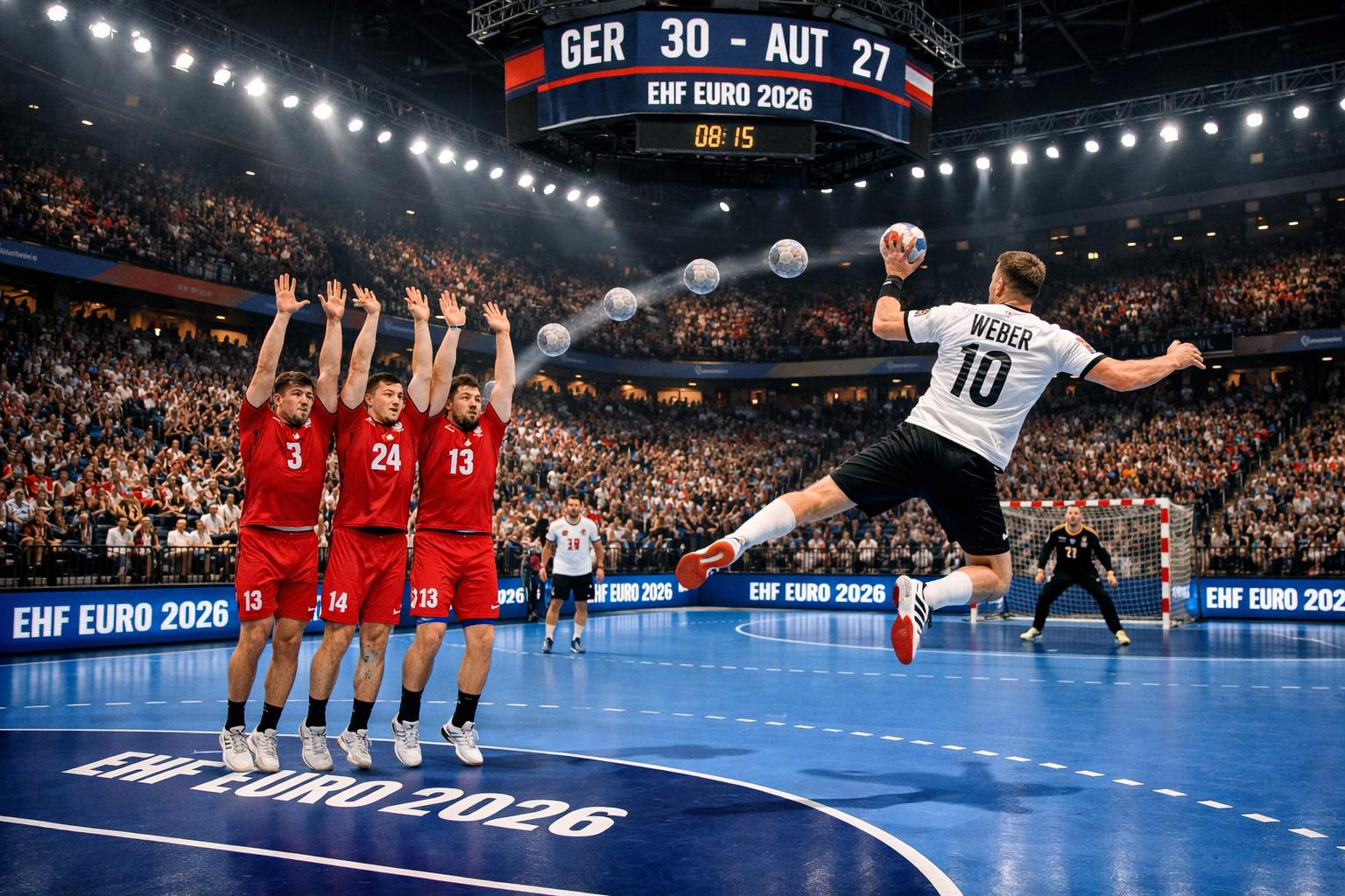 In der 13. Minute erzielte Rückraumspieler Marko Grgic mit einem 108-km/h-Wurf das 5:2. Österreich kämpfte sich zwar zum 6:6 heran (18. Minute), doch Deutschland antwortete mit einem beeindruckenden Lauf. Kapitän Johannes Golla stellte per Doppelpack auf 8:6, Lukas Zerbe schraubte die Führung in einer Phase mit nur einem Gegentreffer auf 11:7.