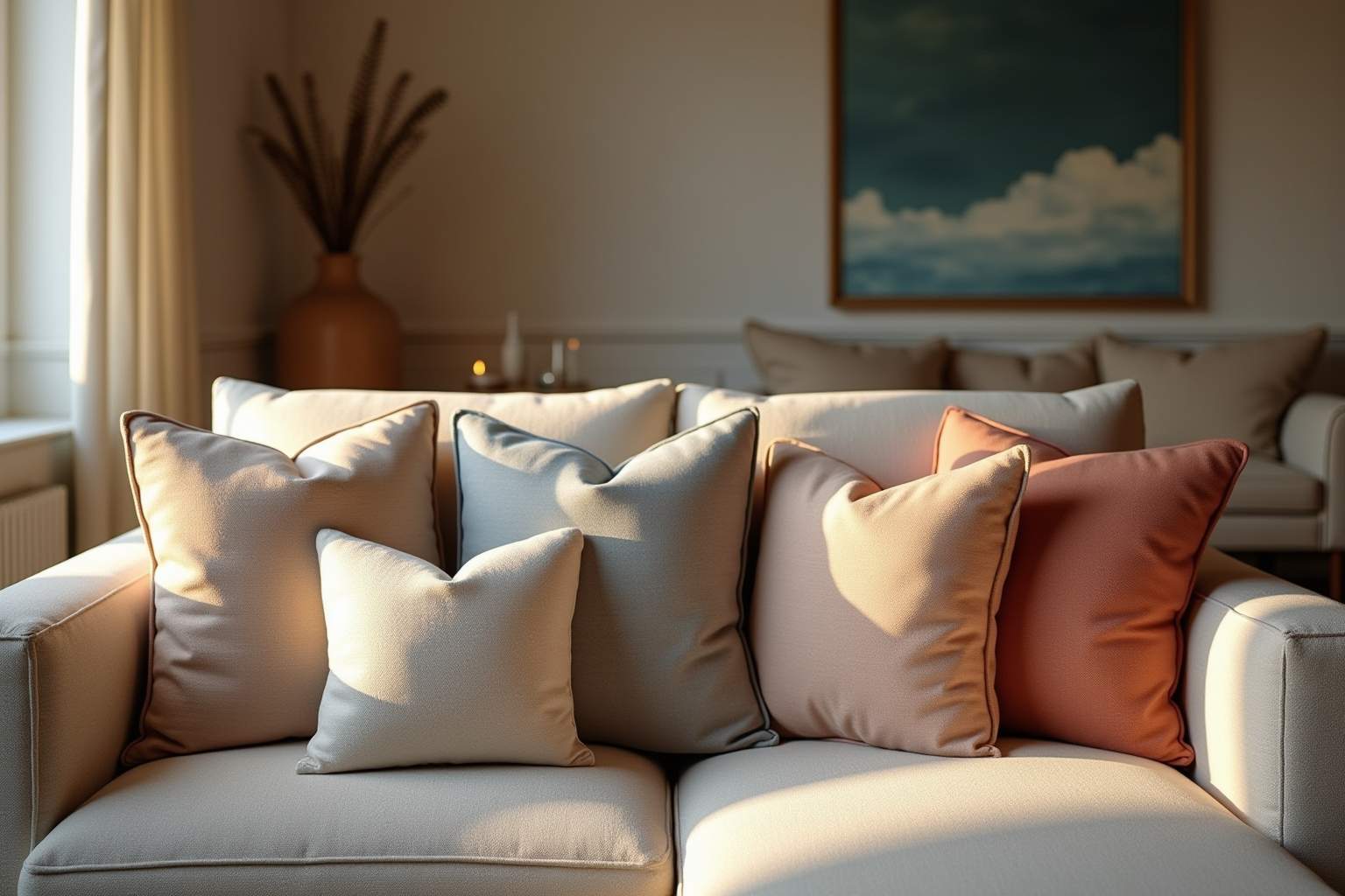 Kombinations-Regel: Die 60-30-10-Regel hilft bei der harmonischen Farbverteilung – 60% Basisfarbe, 30% Sekundärfarbe, 10% Akzentfarbe durch Kissen.