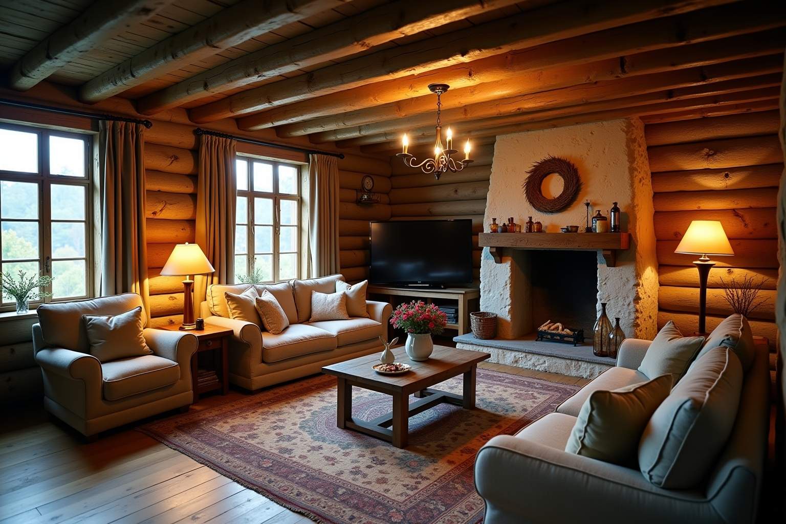 Der rustikale Wohnstil charakterisiert sich durch natürliche Materialien wie massives Holz, Naturstein und handgefertigte Elemente. Typisch sind robuste Möbelstücke mit sichtbarer Maserung, die oft Gebrauchsspuren tragen dürfen. Die Farbpalette umfasst hauptsächlich Erdtöne und warme Nuancen. In der Landhauseinrichtung finden sich häufig traditionelle Handwerkskunst und authentische Details wie schmiedeeiserne Beschläge oder gewebte Textilien. Der Fokus liegt auf Gemütlichkeit und zeitloser Beständigkeit – moderner Minimalismus weicht hier bewusst einer behaglichen, oft etwas derberen Atmosphäre, die Wärme und Geborgenheit ausstrahlt.