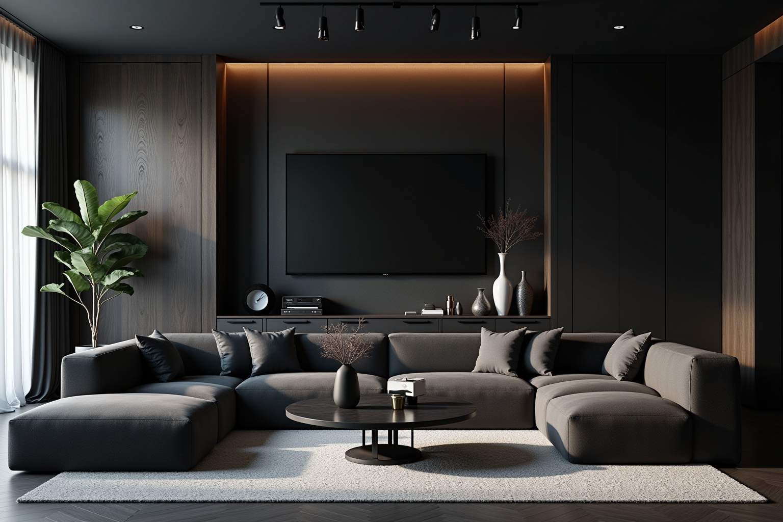 - Schwarze Akzentwände schaffen Tiefe und setzen Fokuspunkte im Raum