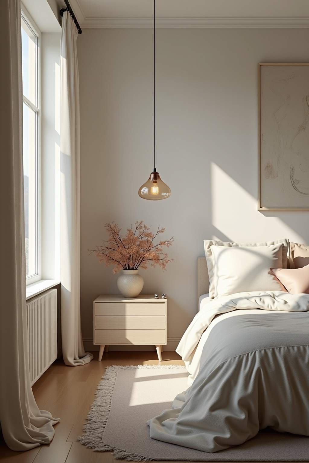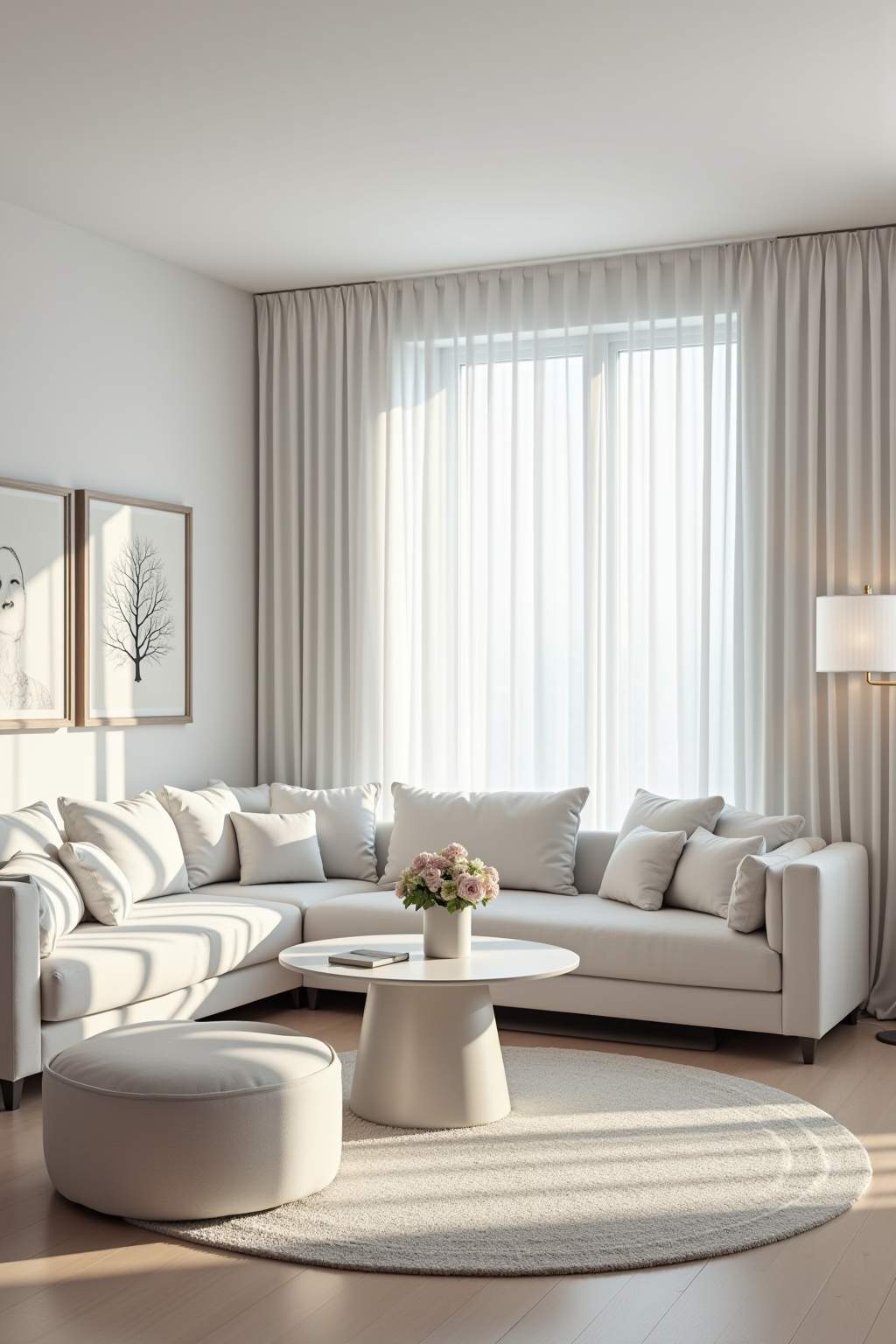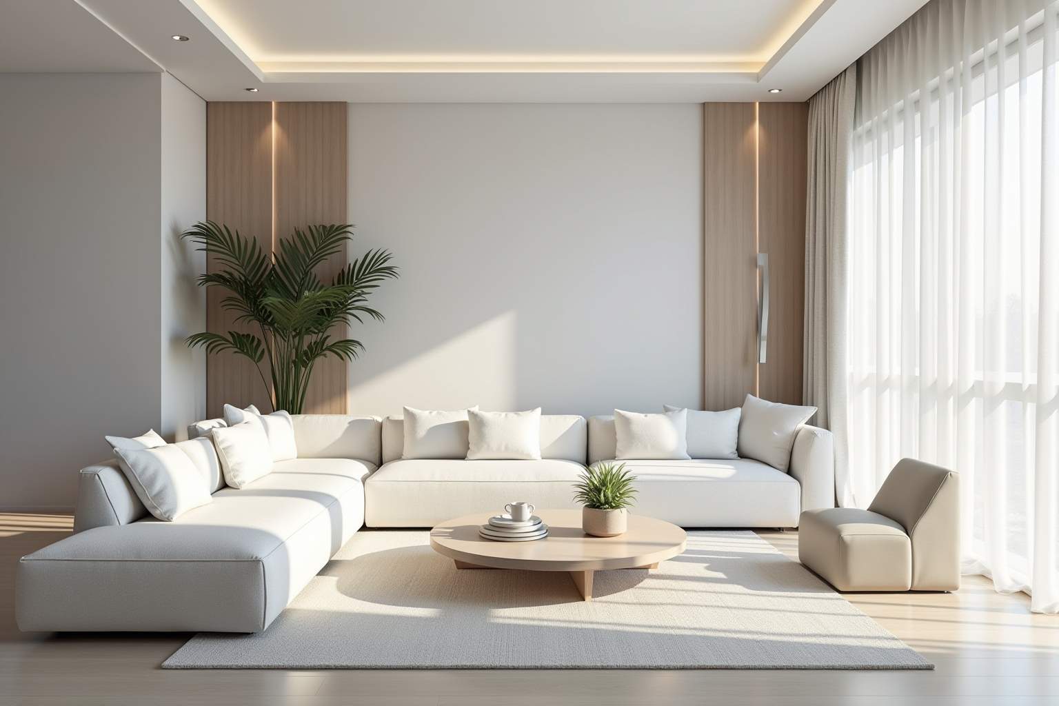 Raumhöhe betonen: Bodenlange weiße Vorhänge und vertikale Elemente schaffen eine visuelle Streckung.